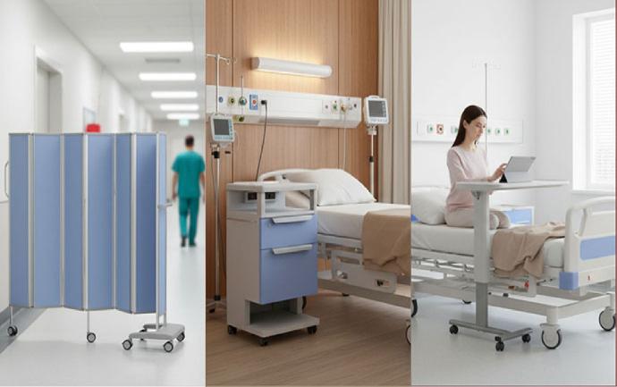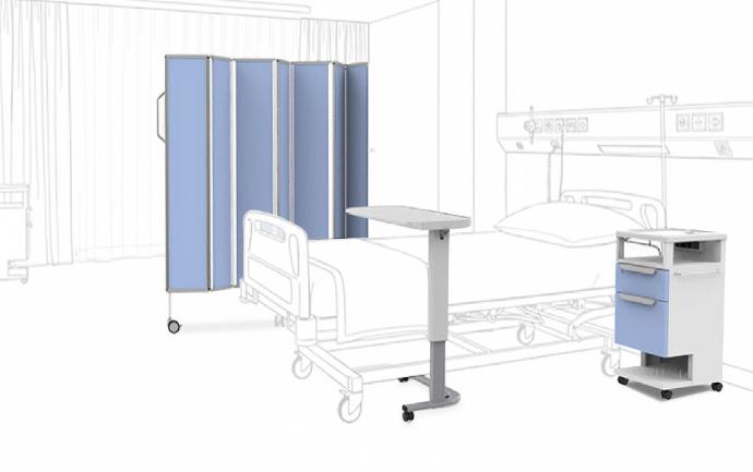 オーバーベッドテーブル、床頭台、スクリーン、点滴スタンド、軽量カートを含み、病室空間のトータルコーディネートを実現します。